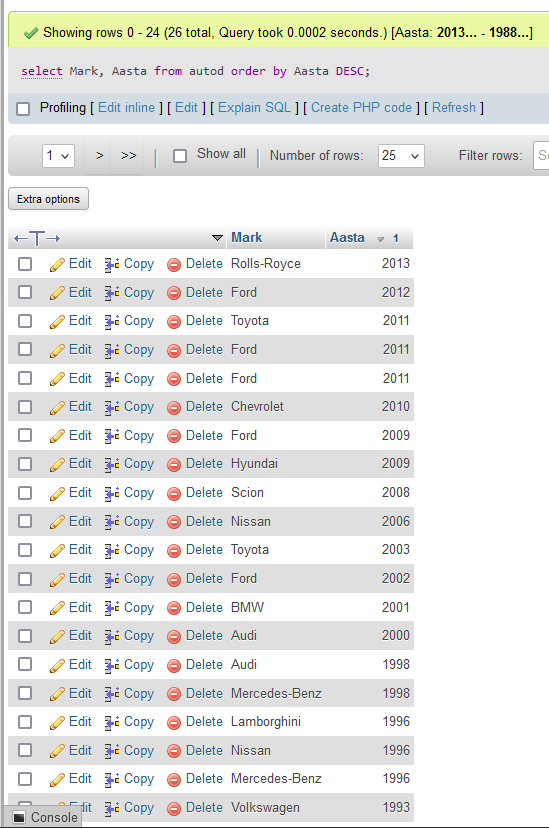 Järjesta autod tootmisaasta järgi kahanevasse järjekorda