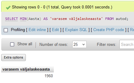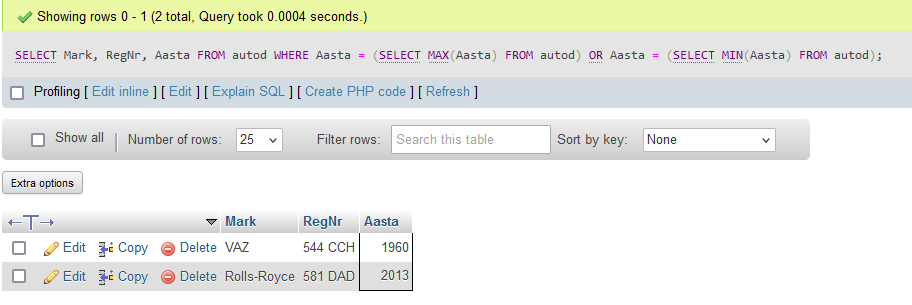 OR Aasta = (SELECT MIN(Aasta) FROM autod);