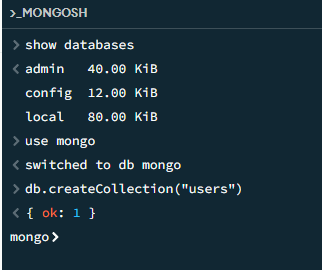 Ülemises osas on mongosh konsool, kus käsk show databases kuvab olemasolevad andmebaasid, seejärel lülitutakse andmebaasi mongo ja käivitatakse db.createCollection(“users”), mis tagastab { ok: 1 } ehk näitab, et users-kollektsioon loodi edukalt. Alumises osas on graafiline kasutajaliides, mis kuvab äsjaloodud users-kollektsiooni kokkuvõtet.