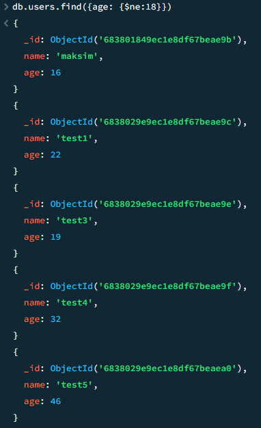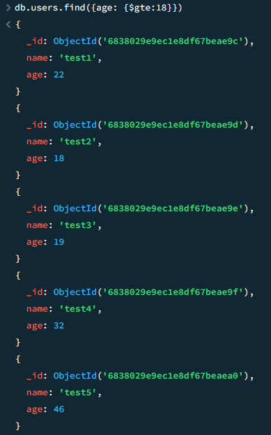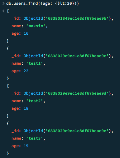 Pildid illustreerivad andmete otsimist MongoDB users kollektsioonist, kasutades find() käsku. Näidatakse, kuidas leida kasutajaid täpse väärtuse järgi. On toodud näide $or operaatori kasutamisest, et leida dokumente, mis vastavad vähemalt ühele mitmest määratud tingimusest. Veel näidatakse erinevate võrdlusoperaatorite kasutamist vanuse välja puhul: otsitakse, kes on nooremad kui teatud vanus ($lt), teatud vanuses või nooremad ($lte), vanemad kui teatud vanus ($gt), teatud vanuses või vanemad ($gte), ning kasutajaid, kelle vanus ei ole teatud kindel väärtus ($ne).