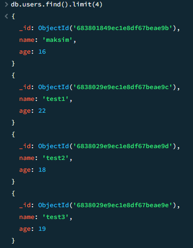 Pildil näidatakse, kuidas MongoDB-s piirata tagastatavate kirjete arvu. Üleval kasutatakse db.users.find().limit(4), et saada maksimaalselt neli esimest dokumenti. Allpool kasutatakse db.users.findOne() kahel viisil: otsides konkreetse _id järgi ja otsides esimese dokumendi, mille vanus on 18.