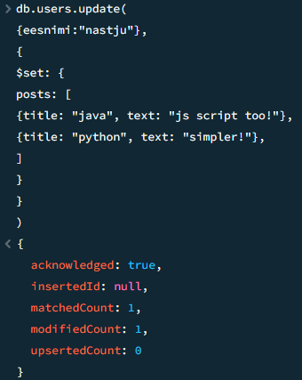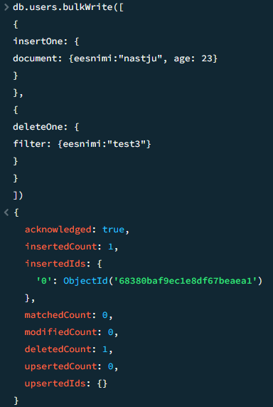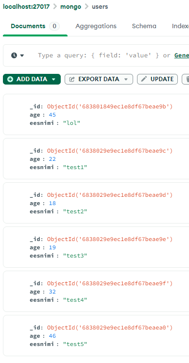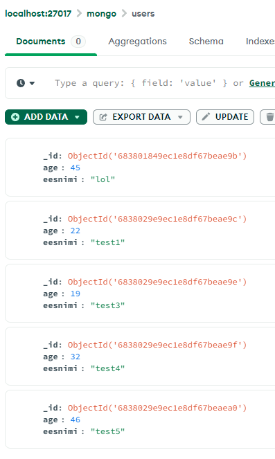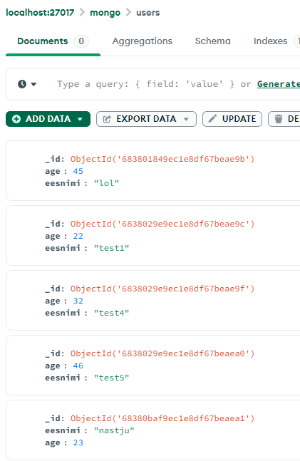 Pildil näidatakse, kuidas MongoDB users kollektsiooni lisatakse korraga mitu uut dokumenti. Graafilises kasutajaliideses on nüüd näha nii eelmisel pildil dokument kui ka need viis uut dokumenti.