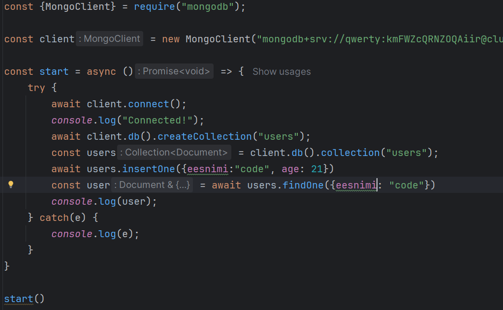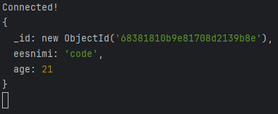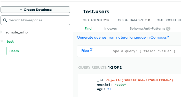 Pildil näidatakse, kuidas MongoDB users kollektsiooni lisatakse uus dokument. Seejärel kuvatakse graafilises kasutajaliideses see äsja lisatud dokument.