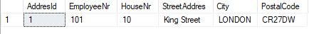 VALUES (1, 101, 10, 'King Street', 'LONDON', 'CR27DW');