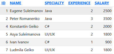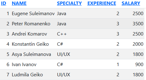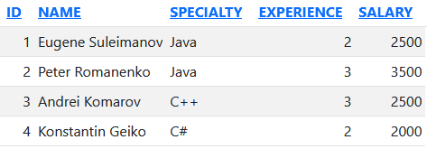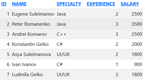 VALUES (1, 'Eugene Suleimanov', 'Java', 2, 2500),