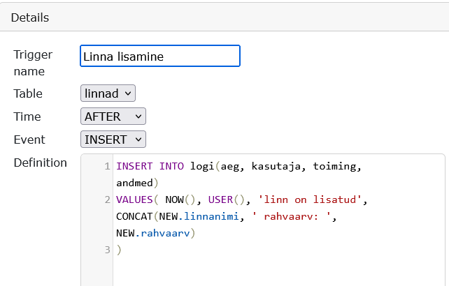 SELECT GETDATE(), SYSTEM_USER, 'linn on lisatud', CONCAT(inserted.linnanimi, ', rahvaarv:', inserted.rahvaarv) FROM inserted;