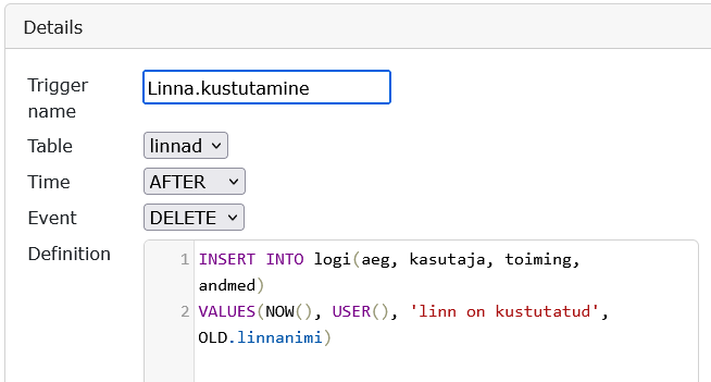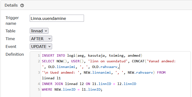 SELECT GETDATE(), SYSTEM_USER, 'linn on uuendatud', CONCAT('Vanad andmed: ', deleted.linnanimi, ', ', deleted.rahvaarv,