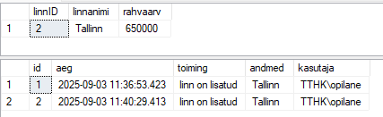 SELECT GETDATE(), SYSTEM_USER, 'linn on lisatud', inserted.linnanimi FROM inserted;